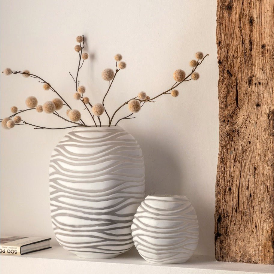 The expertly crafted Gaudi White Stoneware Vase features a modern geometric design in matt grey against a sleek white background. Perfect for contemporary interiors, this vase is both stylish and functional with a waterproof lining for displaying fresh or faux flowers.